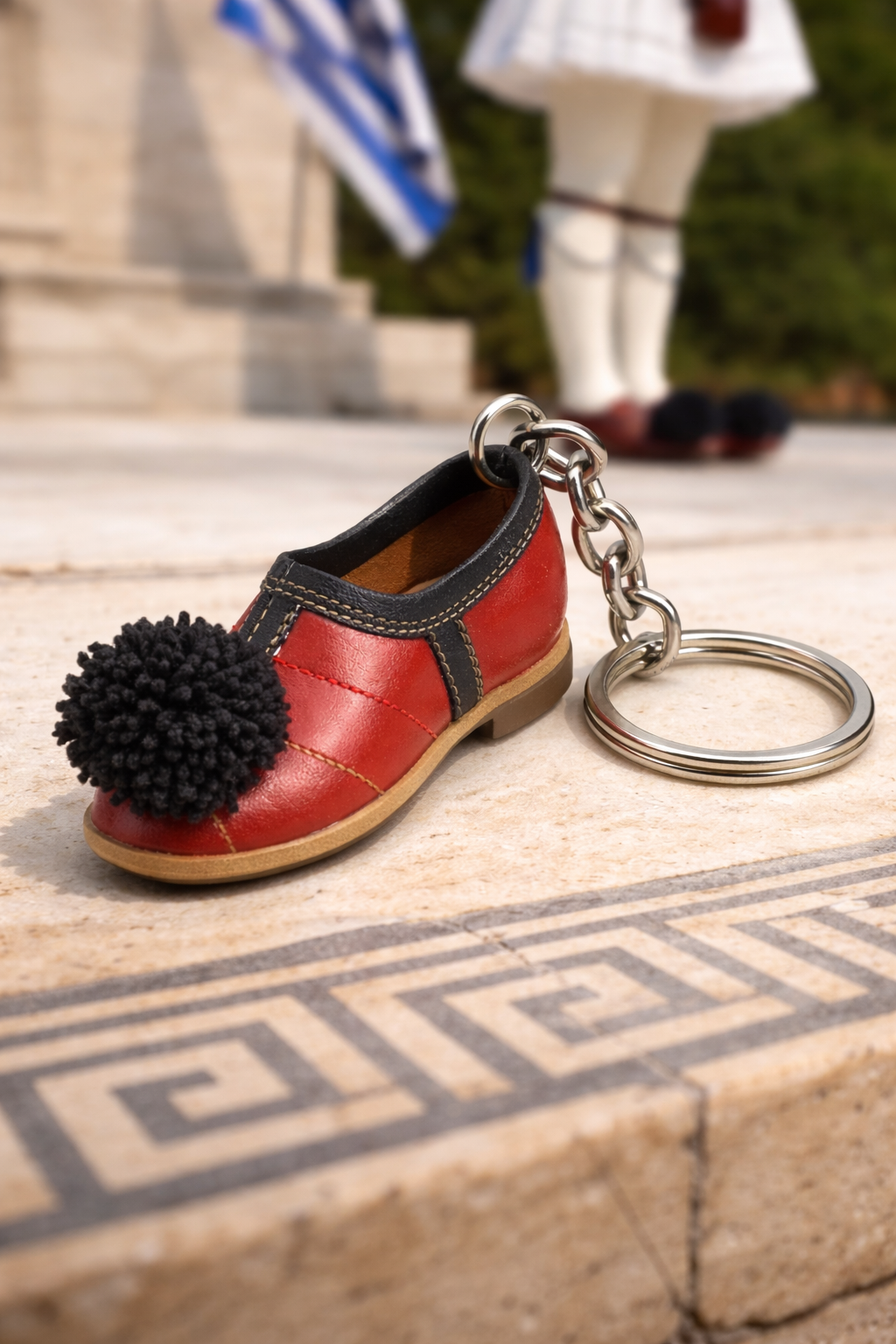 Μοναδικό μπρελόκ σε σχήμα παραδοσιακού τσαρουχιού Εύζωνα, εμπνευσμένο από τα εμβληματικά υποδήματα της Ελληνικής Προεδρικής Φρουράς.